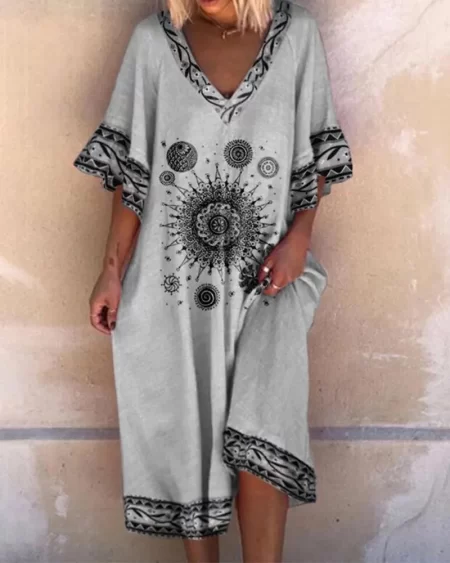 Bohemian Geometric Print Flared Sleeve Casual Maxi Dress